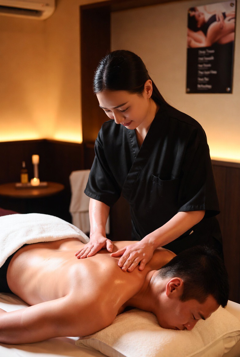 内容:客を四つん這いにさせ、後ろからアナルを舌で深く舐め回しつつ鼠径部をオイルでサワサワ。